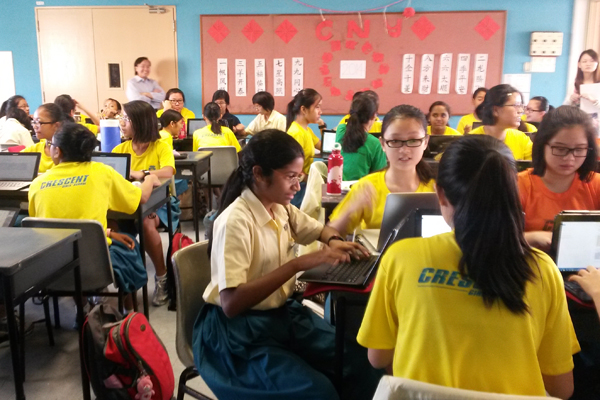 SINGAPORE—Forty students in bright yellow shirts hunched over their computers in Singapore’s Crescent Girls School as they raced against their teacher’s digital stopwatch. They had just a few minutes to add their thoughts about a short film on discrimination into a shared Google Doc and browse the opinions of their classmates.