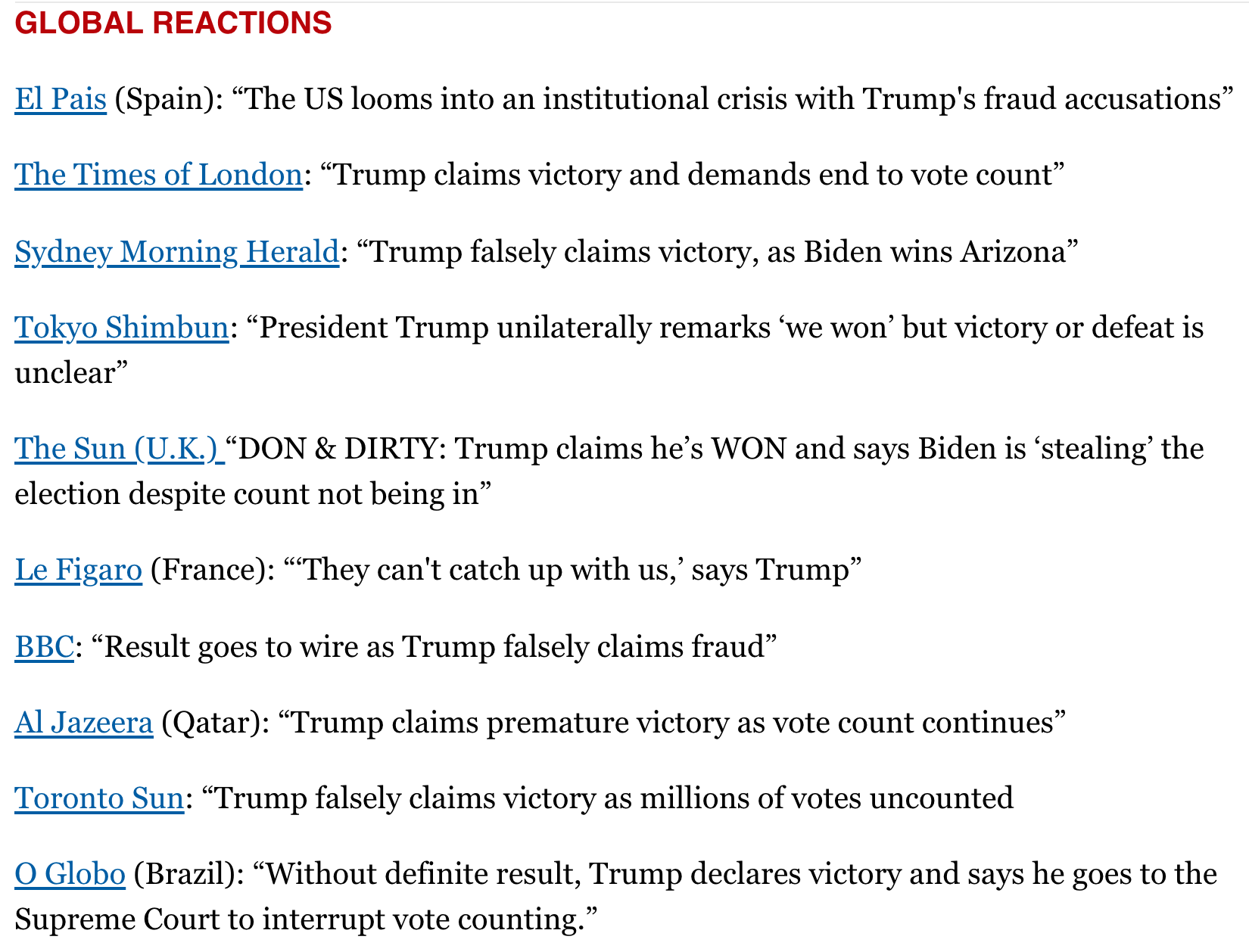 In addition to summarizing the presidential election results so far (using the headline “Trump sets U.S. on course for institutional crisis”), Politico’s Global Translations provided links to headlines from around the world.