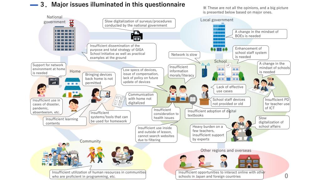 However, when I collected voices from 217,000 students and 42,000 educators through an online questionnaire on this GIGA School Initiative in July 2021, it turned out that there were many problematic issues on the ground – including slow networks, slow digitalization of school affairs, school staff that never got devices, equipment that was too old or insufficient for use inside and outside of the classroom as well as insufficient support by experts. In terms of policy implementation, just distributing a subsidy does not necessarily guarantee that ICT devices are actually used, and there are many steps to be taken before these are put into daily use like pencils and notebooks.