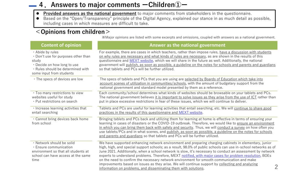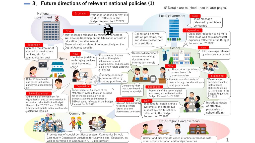 In order to fill in this gap between policy and practice, the Digital Agency, with the ministries concerned, released a joint message to students and educators, and presented their responses in the form of future directions of relevant policies. Some of them actually led to subsequent supplementary budget items approved in December 2021.