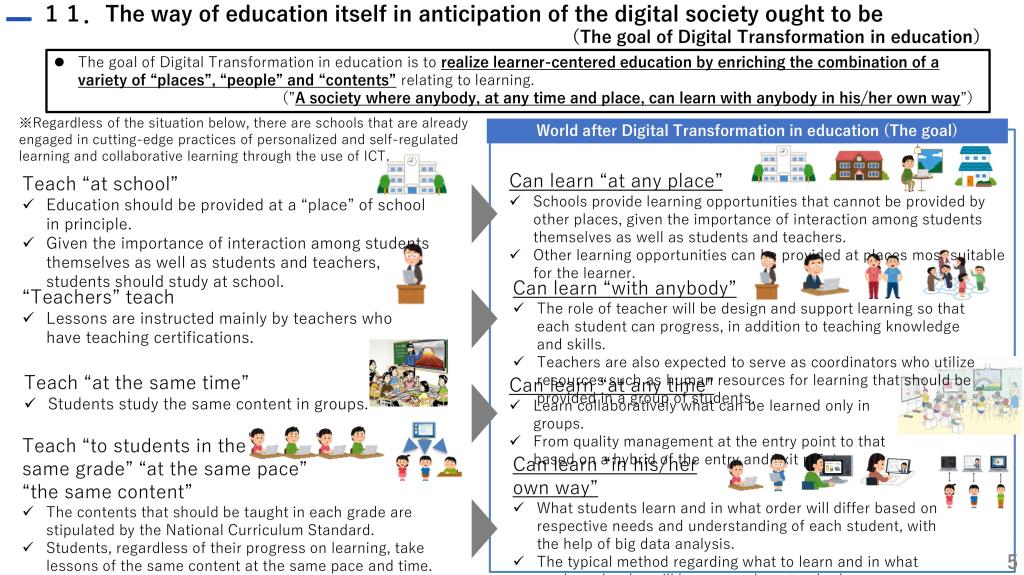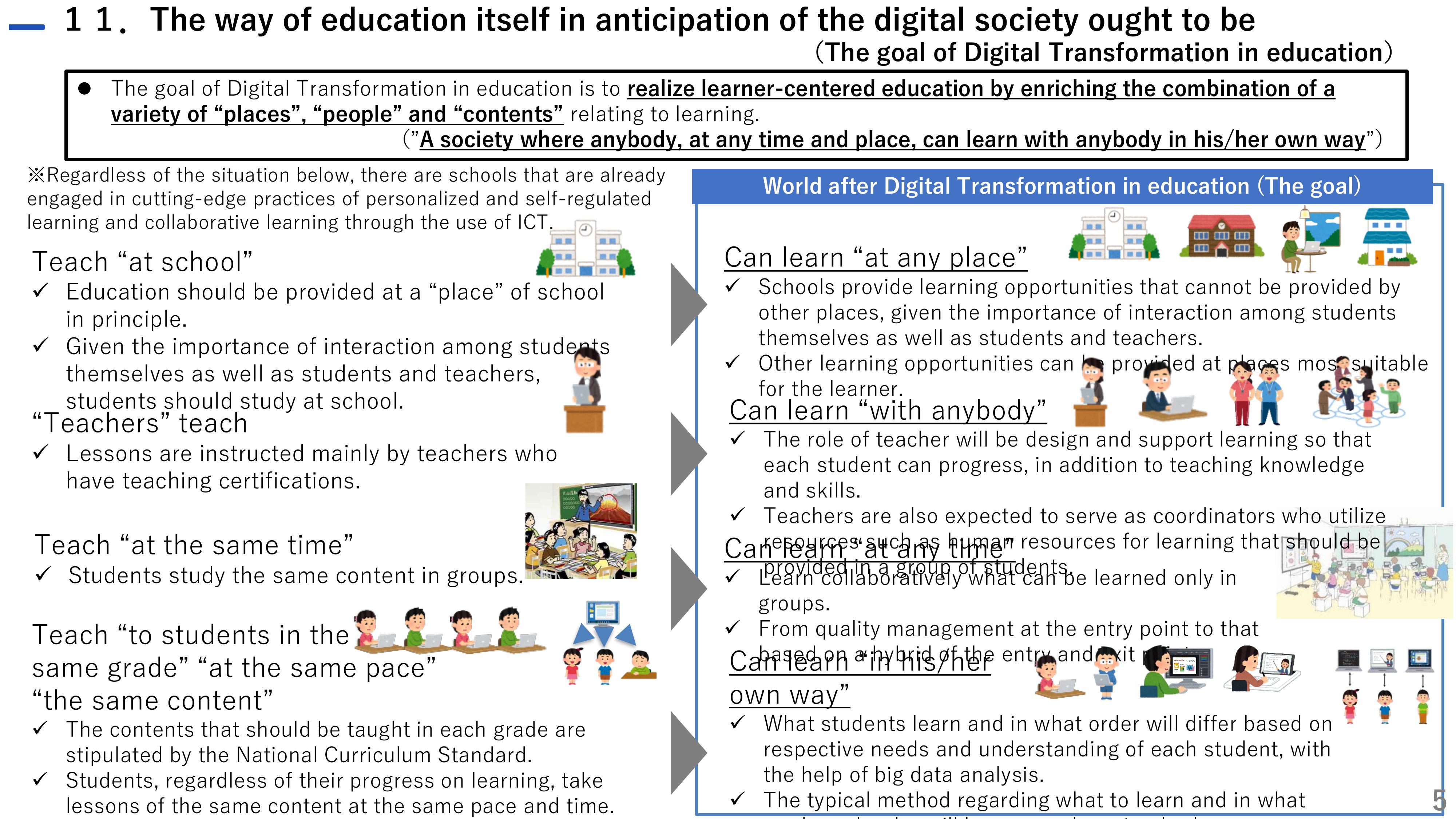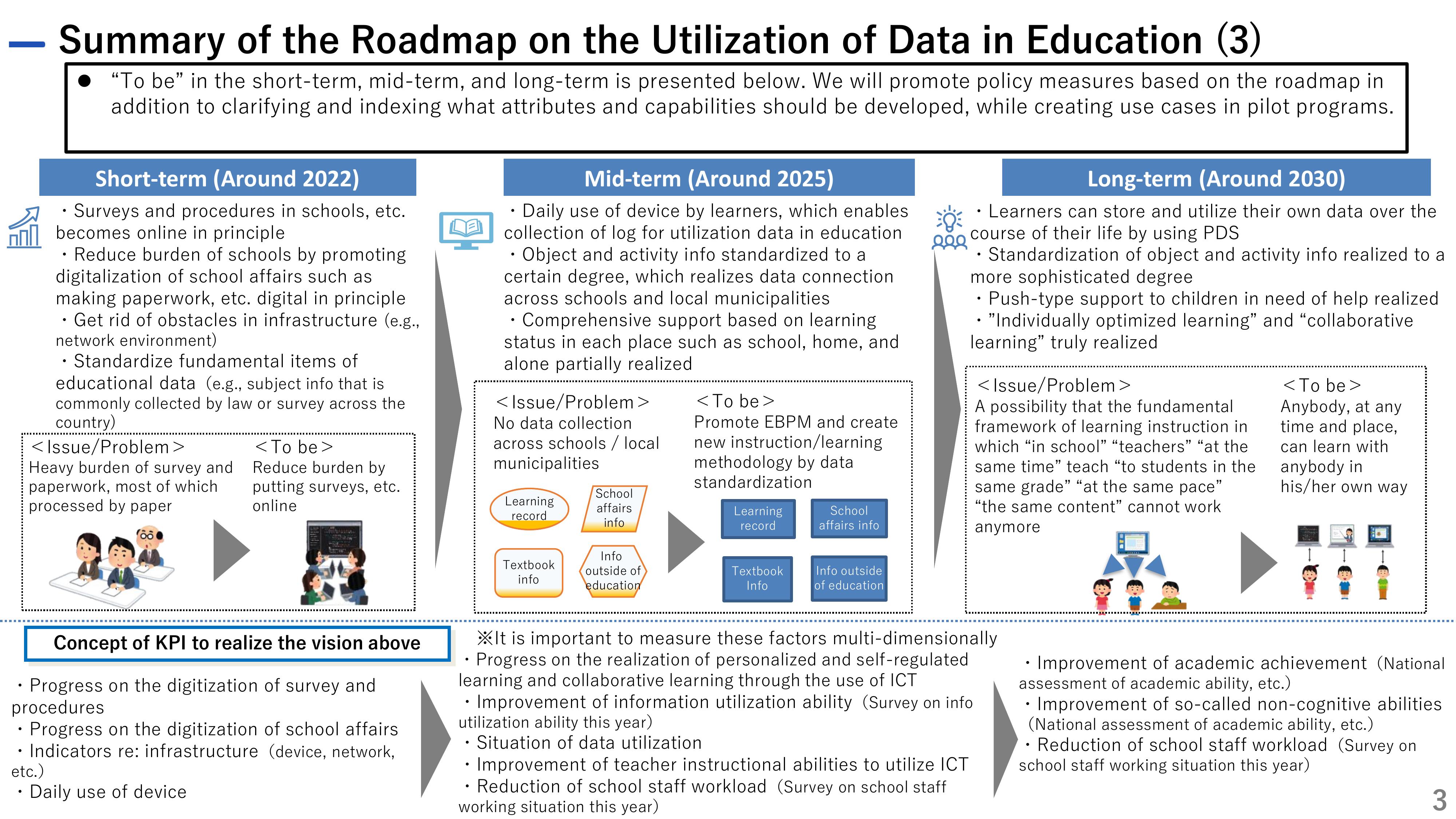 HY: Yes, when we think of three phases of digital transformation – (1) digitization, (2) digitalization, and (3) digital transformation, the current movement is mostly in phase (1) (digitization). However, the potential of digital technology goes far beyond taking paper and face-to-face processes and putting them online; it also lies in promoting student-centered learning as well as providing wraparound and push-type services to children by connecting a variety of data. Therefore, recently (in January 2022), DA and the ministries concerned published “Roadmap on the Utilization of Data in Education.” First, we set the mission of digitalization in education as “a society where anybody, at any time and place, can learn with anybody in his/her own way,” and established “three core goals” – enriching the (1) scope, (2) quality, and (3) combination of data – for realizing that mission. Issues and necessary measures, such as standardizing data in education, the way the creation of the platform in the field of education ought to be, determining rules/policies for the utilization of data in education, are clarified with a timeline.
