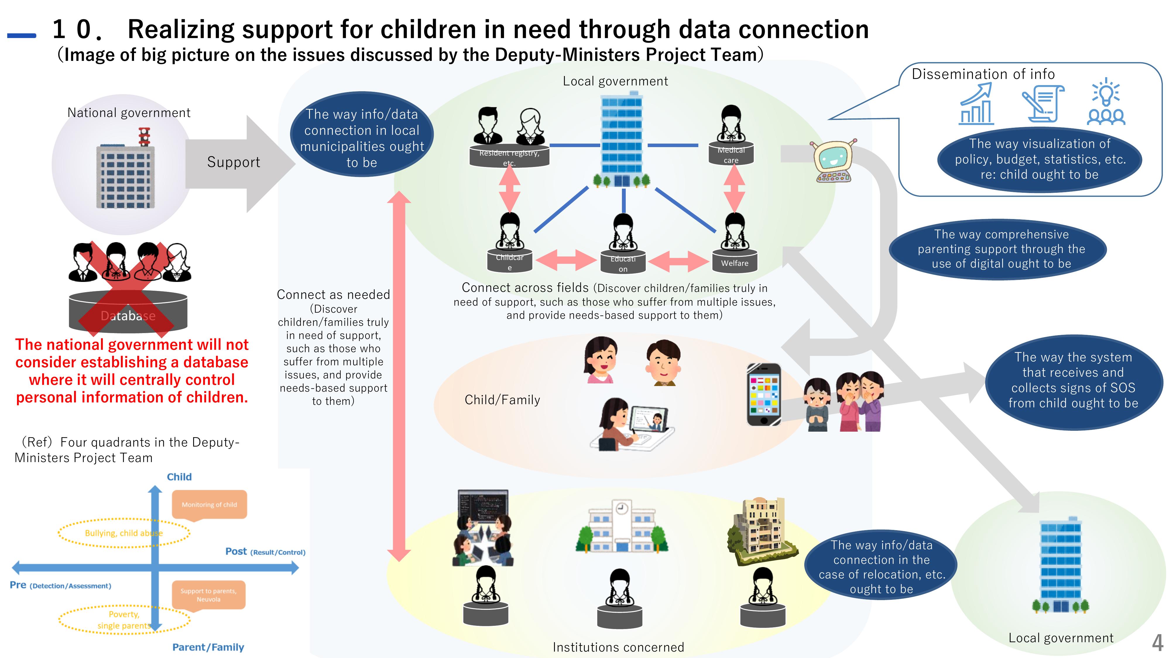 Although most of the policy measures are supposed to be taken by MEXT, DA recently started a pilot project for realizing support for children in need (e.g. poverty, child abuse) through data connection across departments and organizations. As for now, when it comes to data in such fields as education, childcare, child welfare, medical care, etc., they are handled at different departments within the local government. Additionally, there are a variety of institutions concerned such as child consultation centers and schools, each of which, based on their respective role, engage in support for children by utilizing the information that they have. Unfortunately, this sometimes results in each organization/department working in silos without having a clear understanding of which children/families need priority support. For example, the “Child Development Monitoring System” in Minoh City, Osaka Prefecture, classifies children through (1) economic situation, (2) child rearing ability, (3) academic achievement, and (4) non-cognitive abilities, etc.; they then utilize the results for support and monitoring through case meetings, etc.. Building on such practices, we will support local governments by establishing a system for connecting data in education, child welfare, health etc. as needed, utilizing that data to discover children truly in need (e.g. poverty, child abuse) and providing push-type support to them.