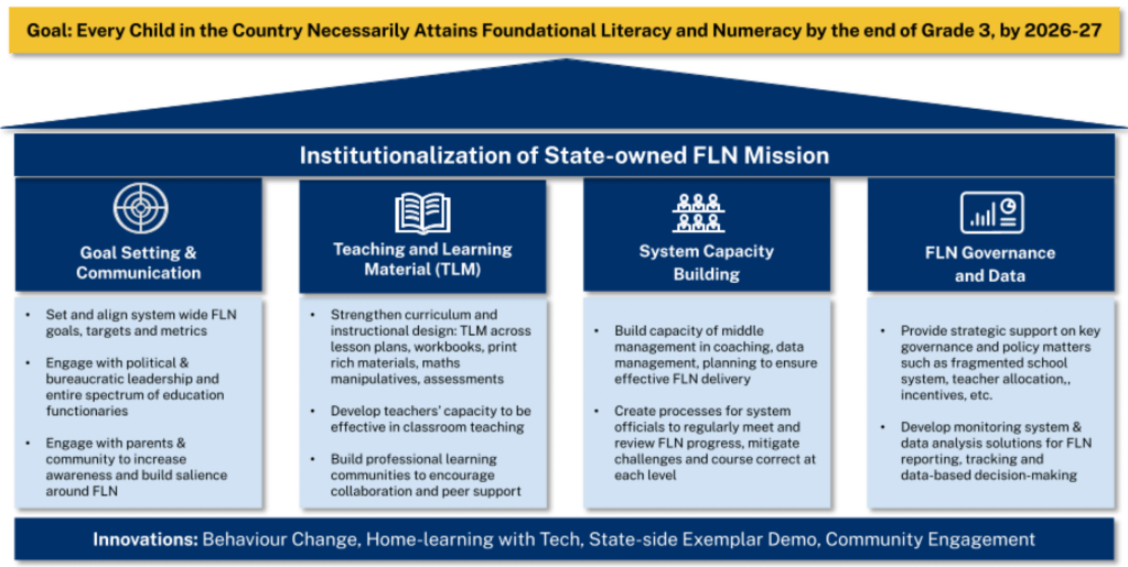 Building a lot on RTI’s approach in Kenya, we are pursuing what we call a four-pillar approach. The first step is to do a system diagnostic – “What are the critical enablers we need?”. One of the challenges in India is that learning gains are very intangible in the early stages of education. In India, the first high stakes assessment happens in grade 10, which is a board exam. That’s very critical and private schools will advertise how well they do, but it’s very late in the cycle of education and there’s no ownership or accountability for earlier stages of education. Actually, the system allows a child to pass out of primary and upper primary school without really having learned. That’s why the first step is How do we get alignment on goal setting and communication?” From the Chief Minister of a state to a parent or an illiterate parent who’s sending a first-generation learner to school, do we all understand what we mean by the mission of education and what we are hoping to achieve? What does learning to read with meaning mean? What does it mean to be able to do basic arithmetic? That becomes the first pillar.