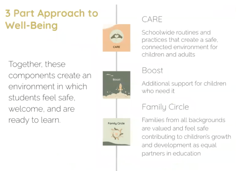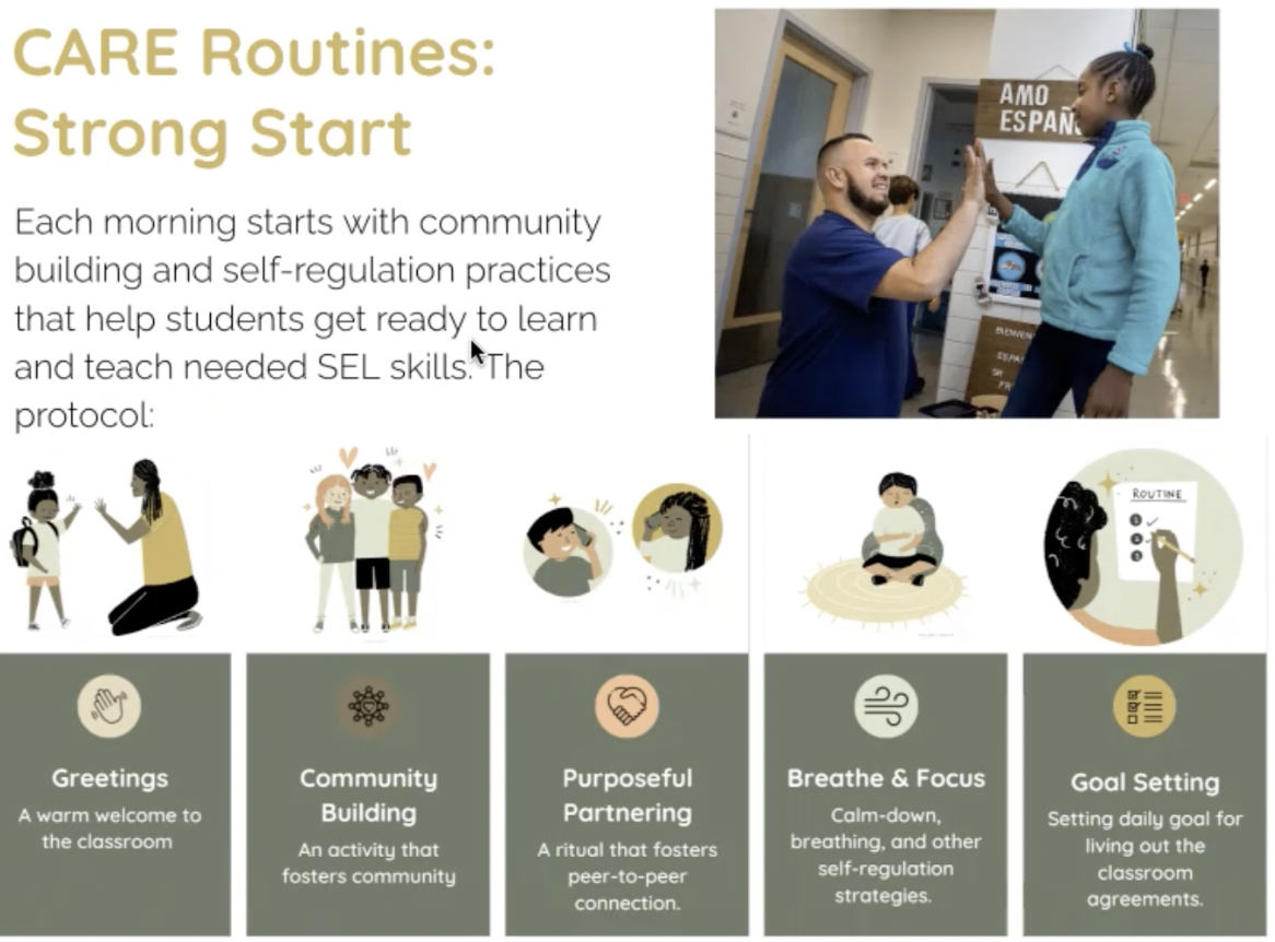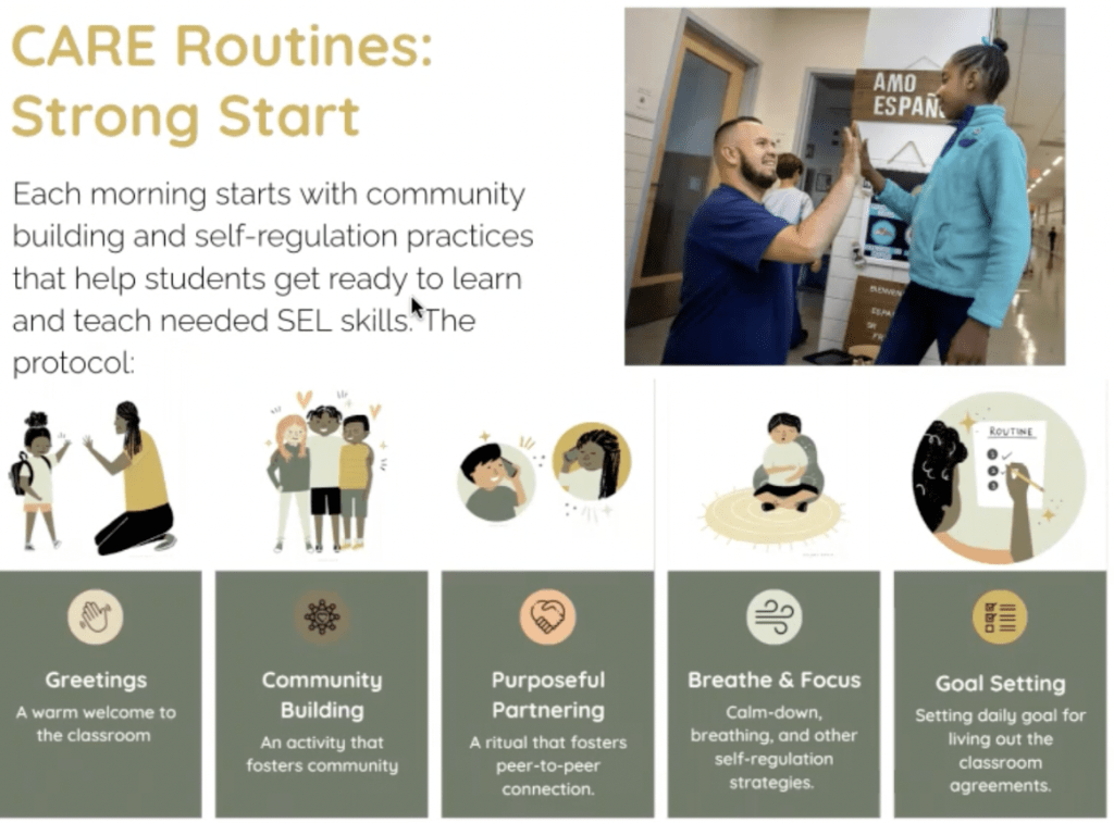 In addition to the physical environment, we have the Strong Start morning routine, inspired by a socio-emotional learning program that Van Ness utilized in its beginning years, which includes support from students beginning with a greeting at the door when they start the instructional day. The aim is to enable kids to be successful, especially if they have come to school with challenges that day or the evening before.