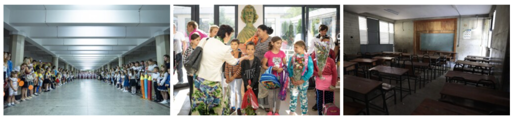 From left to right: “1.) Schoolchildren attend a ceremony for the first day of school in a safe place in an underground subway station, in Kharkiv, Ukraine, on Sept. 1, 2023; 2.) A teacher adjusts the posture of a little boy as children attend a school opening ceremony in Ghergani, Romania, on Sept. 11, 2023. 3.) A classroom sits empty at the closed National School of Republique des Etats-Unis d’Amerique, a public school in Port-au-Prince, Haiti, on Sept. 11, 2023, on what should have been the first day back to school after summer break. According to a few teachers and a parent on site, classes did not resume due to parents’ inability to afford tuition, uniforms and school supplies, as well as families being afraid to go out amid gang violence.”