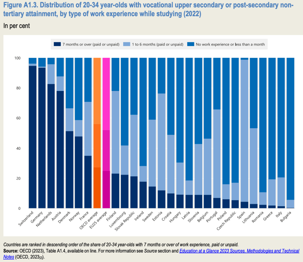 “OECD analyst Viktoria Kis told University World News their data clearly shows that ‘young people who benefited from work-based learning while pursuing VET have better employment outcomes’ and that ‘apprenticeships or internships are a powerful way of connecting VET to labor market needs.’ She said: ‘Some countries have a strong tradition of extensive use of apprenticeships, like Germany and Switzerland. The Norwegian VET system is mostly composed of ‘2+2’ apprenticeships: two years spent at school, followed by two years in workplaces.’”