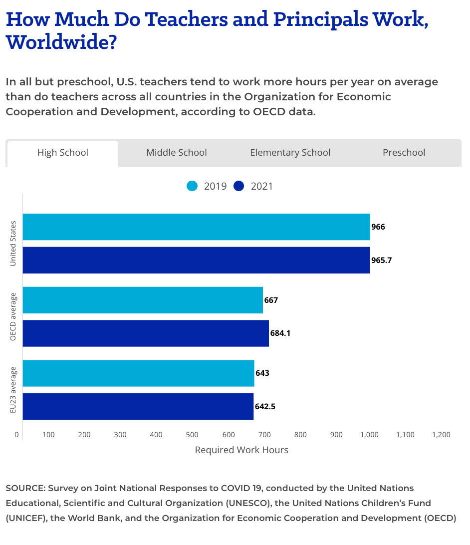 “U.S. elementary school teachers’ work hours haven’t changed much since 2019, but at more than 1,000 a year on average, American educators work more than 200 more hours than their peers worldwide. U.S. elementary and high school teachers work more hours than those in any OECD country but Costa Rica, and middle school teachers work more hours than their peers everywhere but Costa Rica and Mexico.”