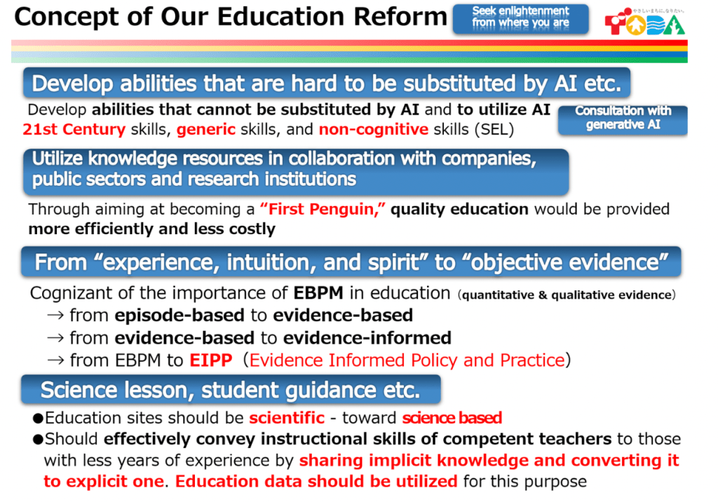 Hirokazu Yokota: Regarding the aforementioned three future policy directions, there were few policies in place for the second (study student guidance scientifically) and third (study class/school management scientifically). And actually, I noticed that teachers have a fear of being evaluated when we implement the first direction (make lessons etc. evidence-based). On the other hand, I noticed that because absenteeism, especially for elementary school students, has been increasing rapidly, detecting early signs of absenteeism by data utilization is actually in greater need for educators (second direction). Moreover, although school leadership is indispensable for these policy reforms, we did not have a common language – lenses or perspectives – to reflect on school management (third direction). So there was definitely a great deal of policy need in these two directions, which urged me to create new reforms in order to realize “an education where nobody will be left behind.”