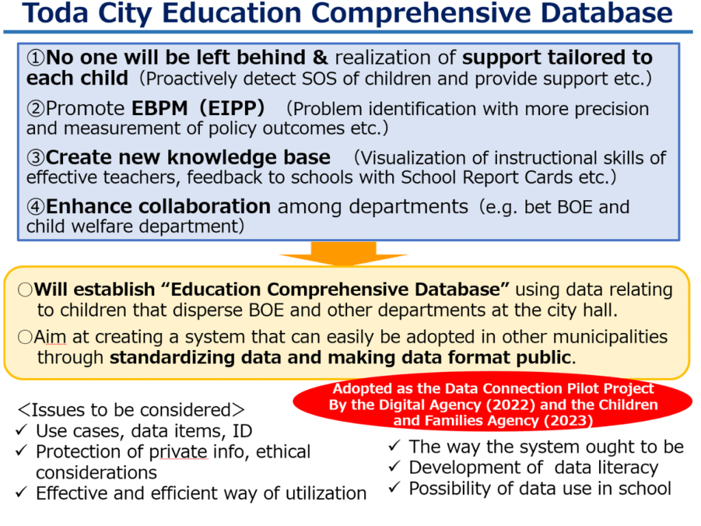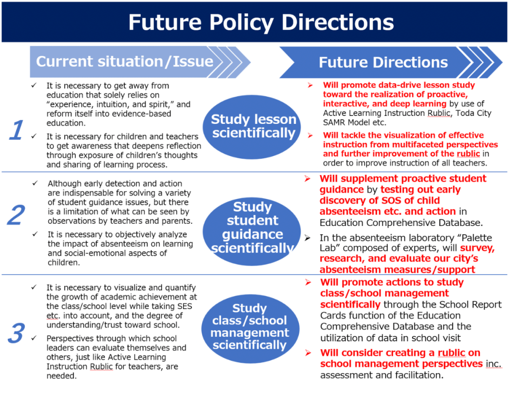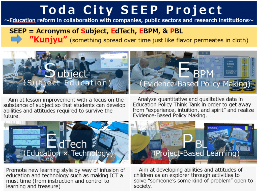 In order to realize this vision, we’ve implemented the Toda City SEEP Project composed of Subject (subject education), Edtech, EBPM (evidence-based policy making), and PBL (project-based learning). And it’s my primary responsibility now to move this ambitious reform into the next phase while narrowing the gap between policy and practice and building the capacity for educators.