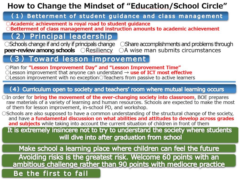Undeterred, Mr. Togasaki continued to say that “in order to bring the movement of the ever-changing society into the classroom, BOE prepares raw materials for a variety of learning and human resources. Schools are expected to make the most of them for lesson improvement, in-school PD, and workshops”. He even went on to say it is extremely insincere (for educators) not to try to understand the society where students will dive into after graduation from school, and we should make school a learning place where children can feel the future. “Avoiding risks is the greatest risk, “ he warned, and he welcomed an ambitious challenge (even if it is 60 points out of 100) rather than a mediocre practice (that is 90 points). These are the words now I can hear from principals and other school staff, which means the superintendent’s vision has permeated into the ground over the eight years.