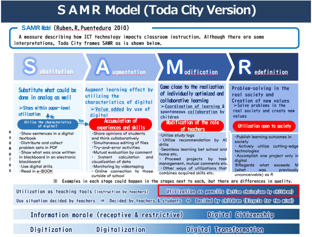 For the first direction (study lesson scientifically), we sought to promote data-driven lesson study toward the realization of proactive, interactive, and deep learning, as is stipulated in the new national curriculum standard (Courses of Study). Therefore, as a common language to transform teacher-led instruction into student-centered instruction, we shared with schools the Toda City Version SAMR model.