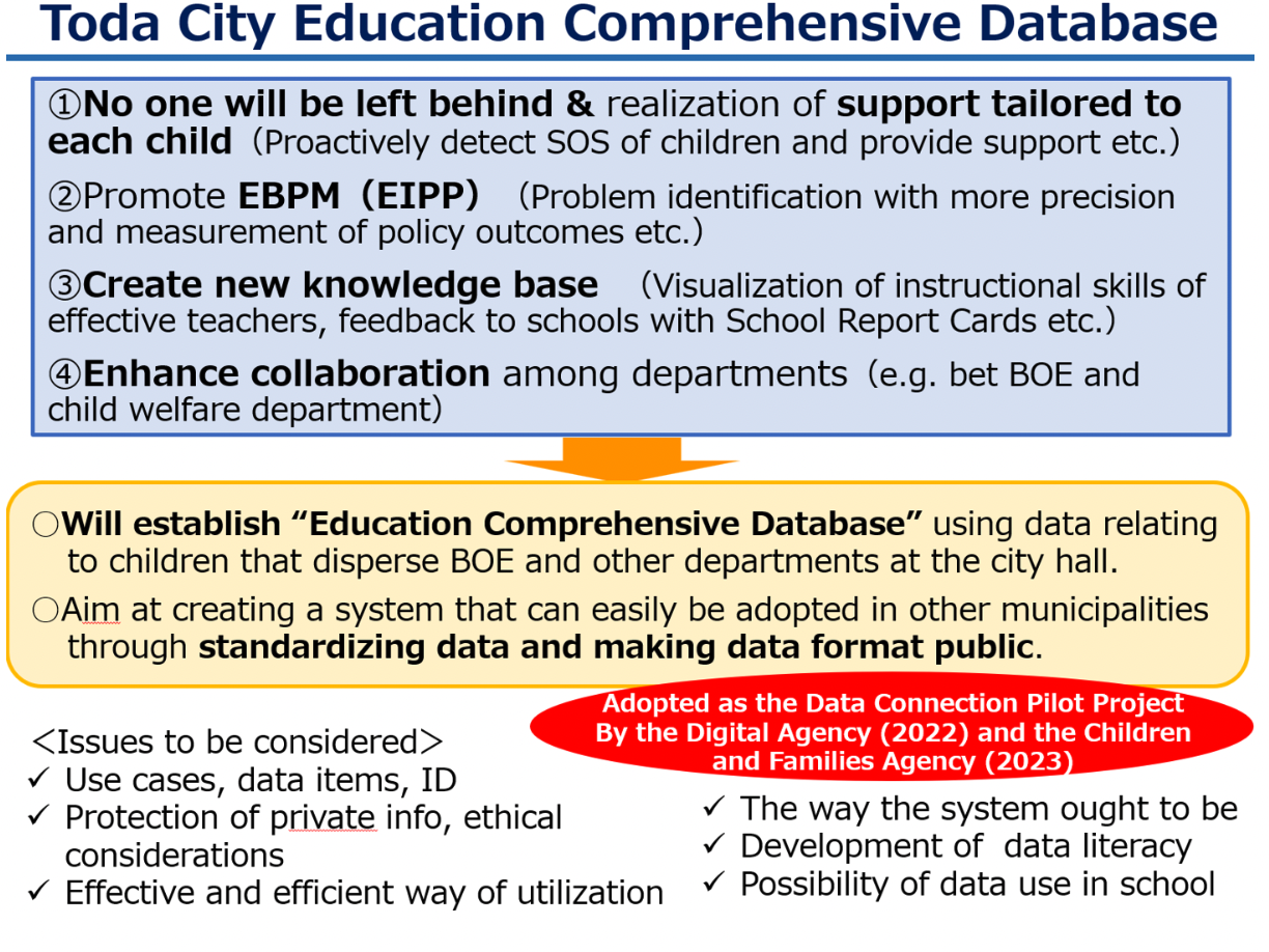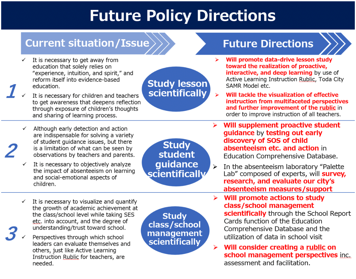 In order to realize this vision, we’ve implemented the Toda City SEEP Project composed of Subject (subject education), Edtech, EBPM (evidence-based policy making), and PBL (project-based learning). And it’s my primary responsibility now to move this ambitious reform into the next phase while narrowing the gap between policy and practice and building the capacity for educators.