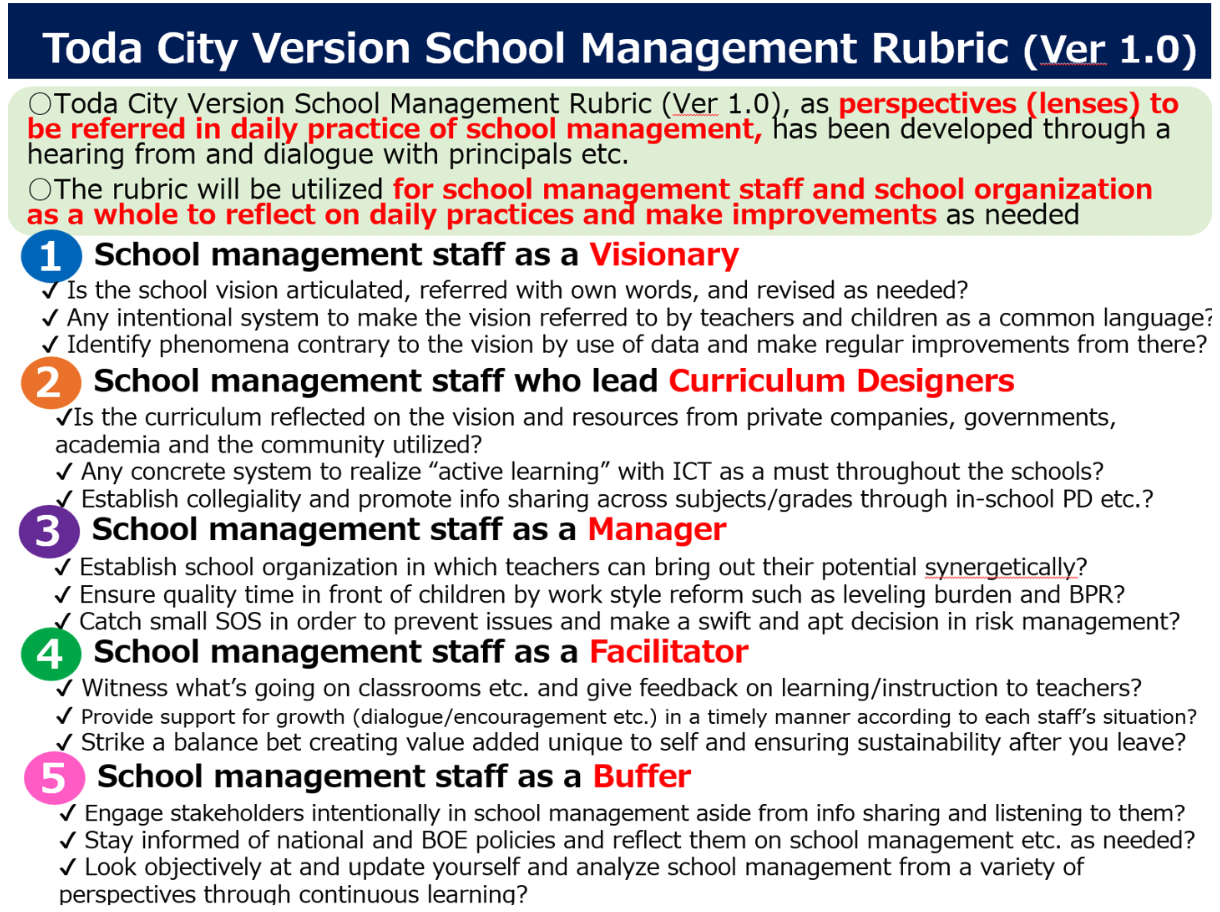 For the third direction of studying class/school management scientifically, based on the discussion with principals, head teachers and others over some 40 hours, I drafted the Toda City Version School Management Rubric. I believe that our city is the first in Japan to publish such a rubric. Our basic concept here is to provide feedback on school management just like providing feedback on classroom instruction for continuous improvement. As you can see from the slide below, each element of this rubric is verbalized as “a challenging goal” – to be accomplished if and only if school management staff make concerted and intentional efforts over the time. For example, although most of the schools articulate their school visions, there are few schools that have intentional systems to make the vision referred to by teachers and children a common language (No.1 – school management staff as a visionary). Additionally, there are some teachers who engage in transformational practices in every school, but spreading this “good practice” throughout the school is extremely difficult (No.2 – school management staff who lead curriculum designers). With this rubric, the BOE and school management staff have common ground to talk about where we are, what we are doing and what we are not, and what we can do together for further improvement.