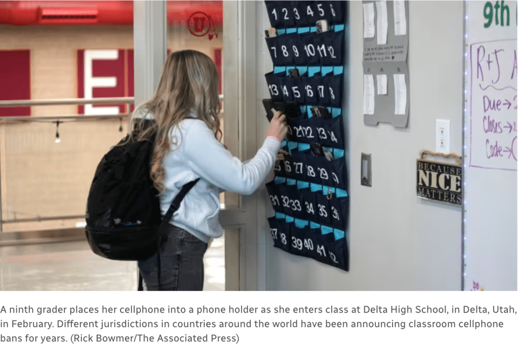 Today, we roundup some of the many headlines that discuss the banning of cellphones as students head back to school in many parts of the world. Part 1 of this year’s Back-to-School scan provided an overview of some of the many election-related education stories that have appeared in the press as the new school year begins in the northern hemisphere (Politics, Policies, and Polarization: Scanning the 2024-25 Back-To-School Headlines in the US). Part 2 brought together stories addressing the cost of supplies, shortages – particularly of bus drivers, hot weather and other issues (Supplies, Shortages, and Other Disruptions? Scanning the Back-to-School Headlines for 2024-25).