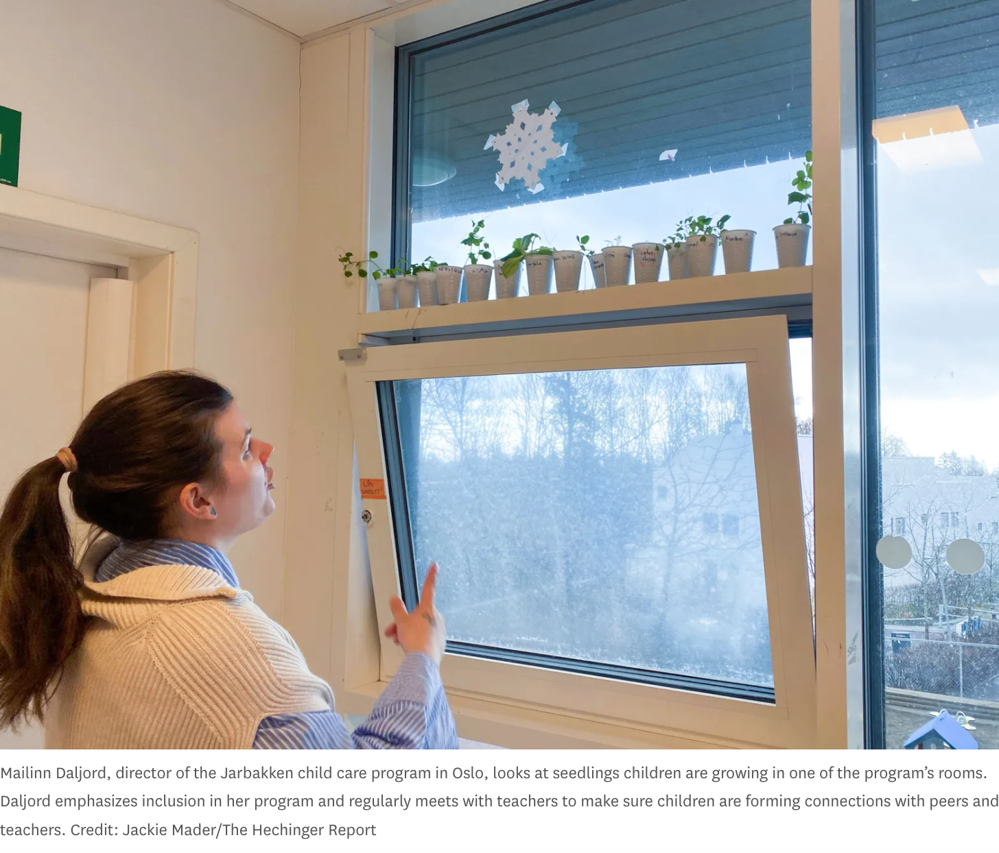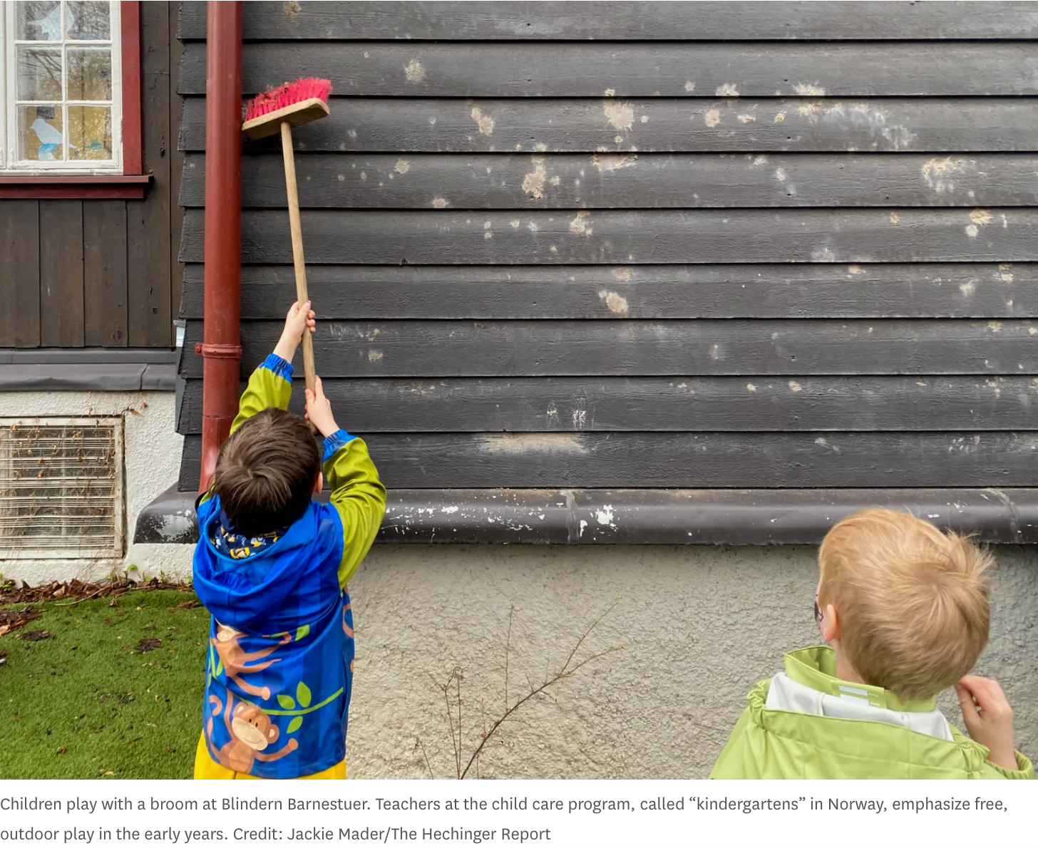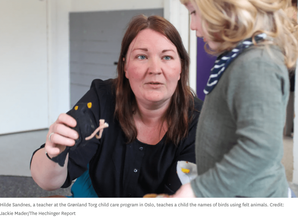 “A really important pillar of Norway’s early ed philosophy is the value of childhood in itself,” said Henrik D. Zachrisson, a professor at the Centre for Research on Equality in Education at the University of Oslo. “Early ed is supposed to be a place where children can be children and have the best childhood possible.”