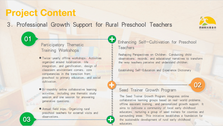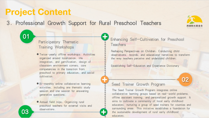 Given these challenges, the Foundation now provides early childhood teachers with materials and training to help prepare them for the unique demands of their rural context. For preschool teachers, for example, these efforts combine online teaching and research with offline training and study tours to provide sustained support.