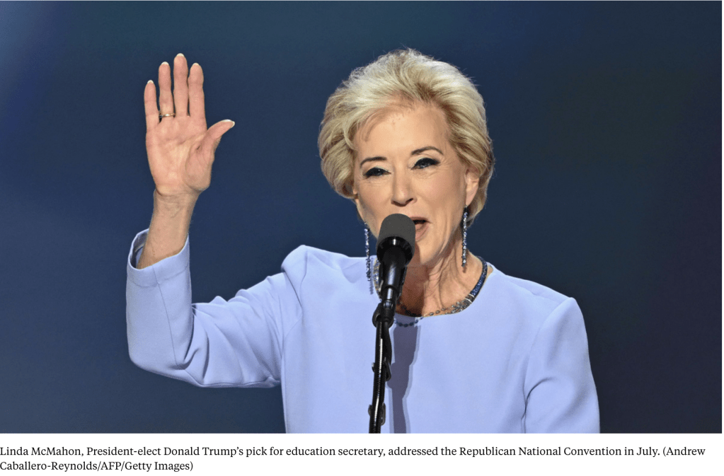 Trump picks Linda McMahon to lead, and possibly dismantle, Education Department, Chalkbeat