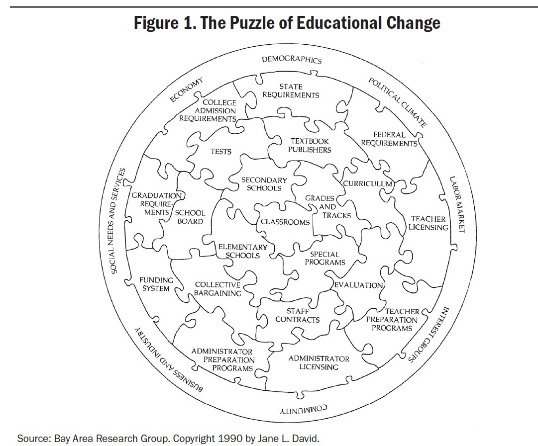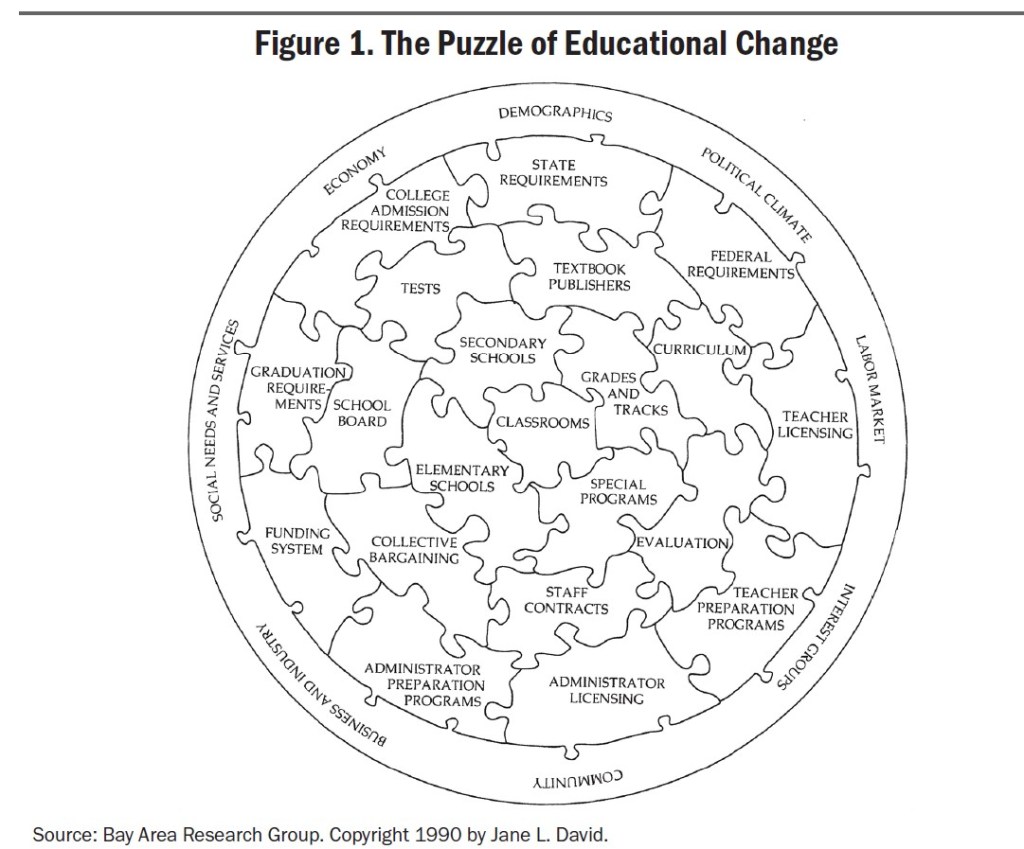 To illustrate this portrayal of education policy by drawing on the Elmore turtle analogy, he borrows an image from his research colleague Jane David, who calls it “the puzzle of educational change.” Mike explains in the Report, “David’s diagram is daunting in its complexity and helps illustrate why it has taken years of effort even to begin to align the supports for standards-based reform, long after support for the concept itself took hold.” In other words it’s one thing to create strong standards. It’s quite another for “those standards” to make “their way into instruction” inside the classroom.9