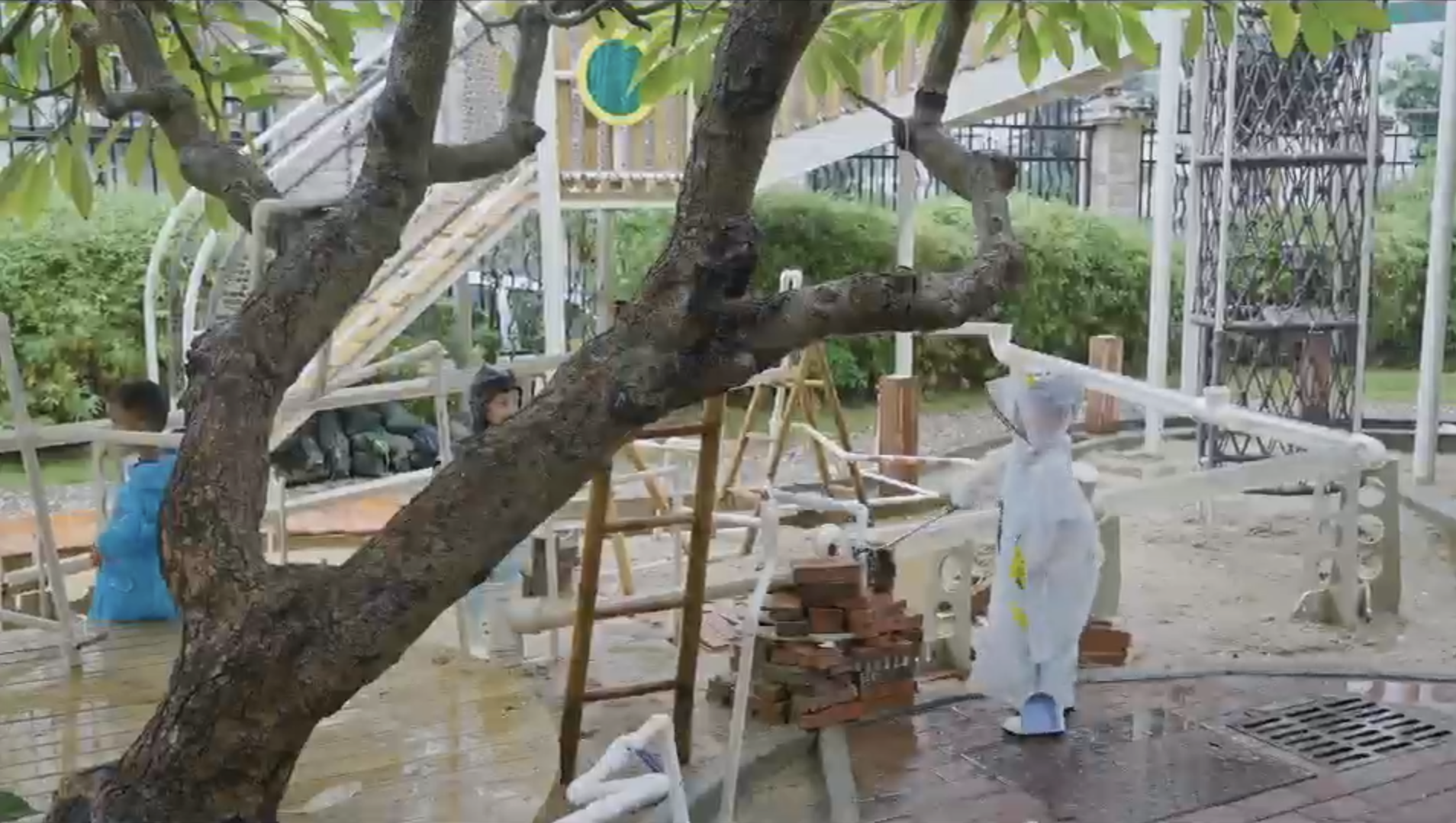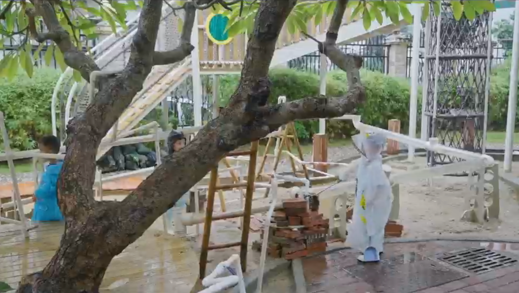 The construction areas continued past an open wall where children in clear plastic slickers pumped water through a series of pipes in the rain.