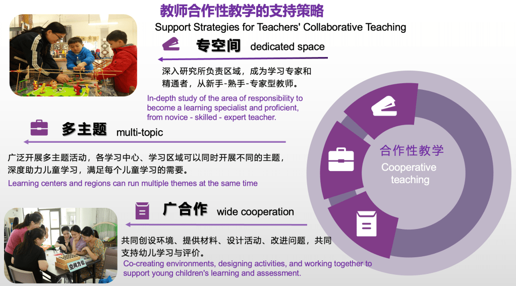 Clearly, it took significant investments to bring this vision to life. But what I saw relied primarily on two things – materials that are all around us and the time and care to think about how to use them to support young children’s development. Beyond the awe-inspiring facilities and resources, the educational infrastructure that underlay every room and learning center stood out. Although I could not be sure of everything that was said in a quick 2-hour visit, an interpreter and my Chinese friends and colleagues explained that after breakfast, children are given the choice of where to play, and after lunch and outdoor play, the children gather again to discuss and reflect on how they spend the day. I heard about the curriculum that guided the design that of every room and learning center, how it connected to the Chinese national early childhood curriculum, and what kind of scaffolding and support teachers could provide.
