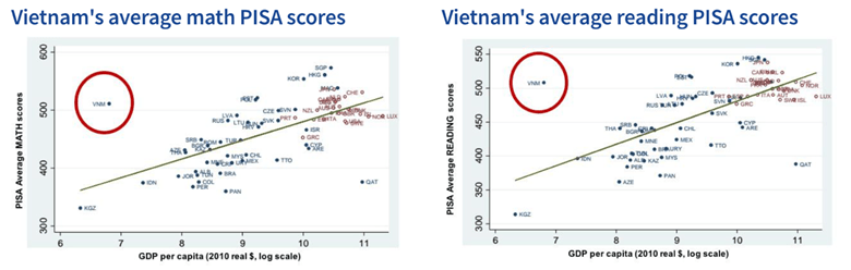 Although many countries are working to expand access to schooling, educational quality remains a critical concern around the world. But the results of the 2012 PISA tests suggests that Vietnam has been able to increase both access and quality significantly. Those results showed that by 2014, Vietnam’s 15-year-olds were 17th in math and 19th in reading out of 65 countries. More astoundingly, that performance made Vietnam an outlier – performing significantly higher in both reading and math than other education systems with a comparable GDP.