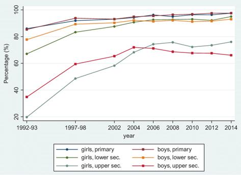 As many countries with developing education systems continue to try to provide access to education for all students, Vietnam has achieved school enrollment rates near 100% in kindergarten, primary, and lower secondary schools. A significant amount of that growth took place in less than 20 years, between 1990 and 2012. Enrollment in secondary schools in particular tripled in only 14 years, rising from about 23% in 1992 to almost 75% by 2006. Although secondary school enrollment remains a concern, as there has been only a slight increase since then, the mean years of schooling for adults in Vietnam is still higher than expected, given its per capita income.