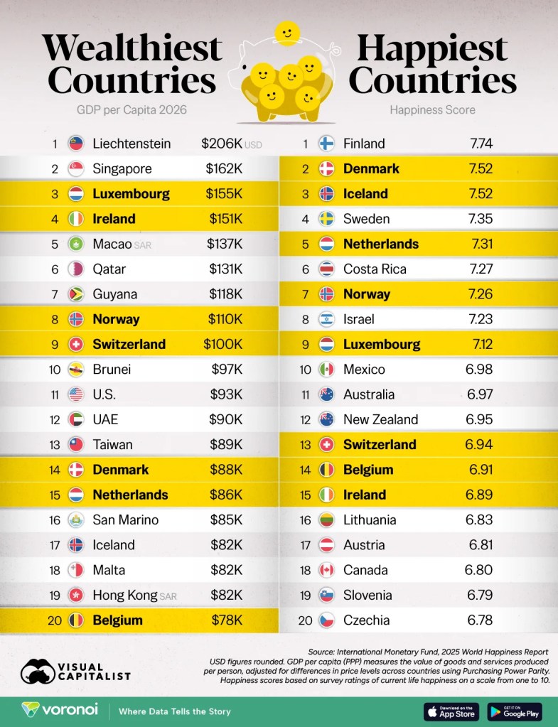 Ranked: The World’s Richest Countries vs. the Happiest Countries, Visual Capitalist