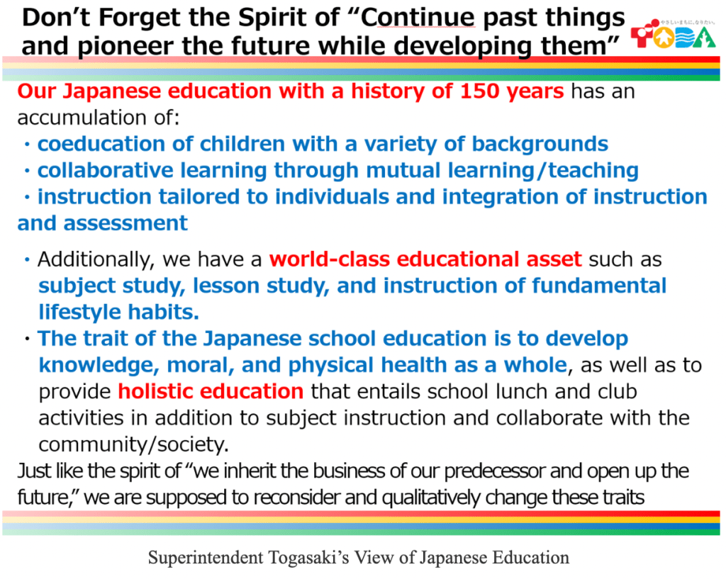 “we should make school a learning place where children can feel the future. ‘Avoiding risks is the greatest risk,’ he warned, and he welcomed an ambitious challenge (even if it is 60 points out of 100) rather than a mediocre practice (that is 90 points).” – Tsutomu Togasaki, Superintendent of Toda City