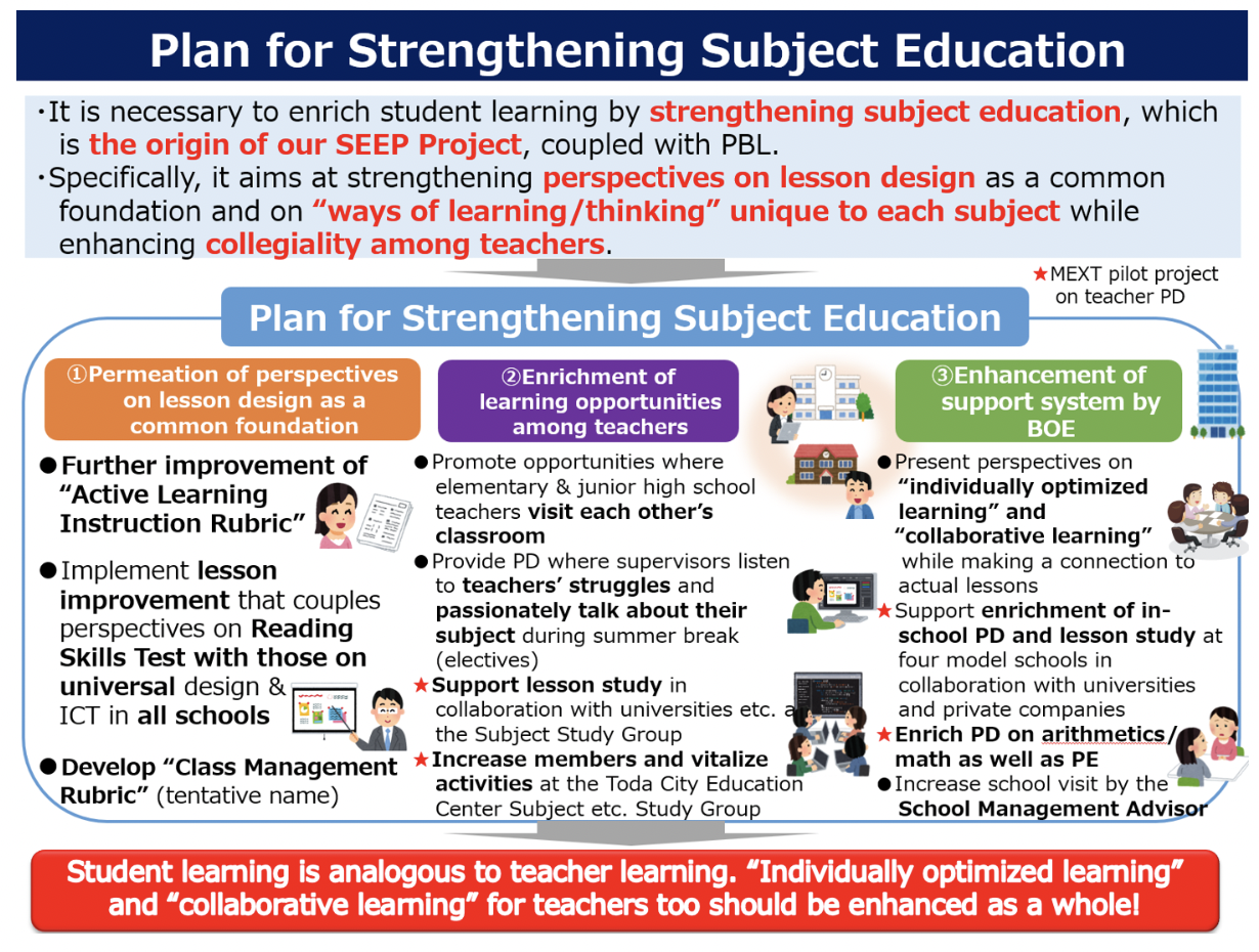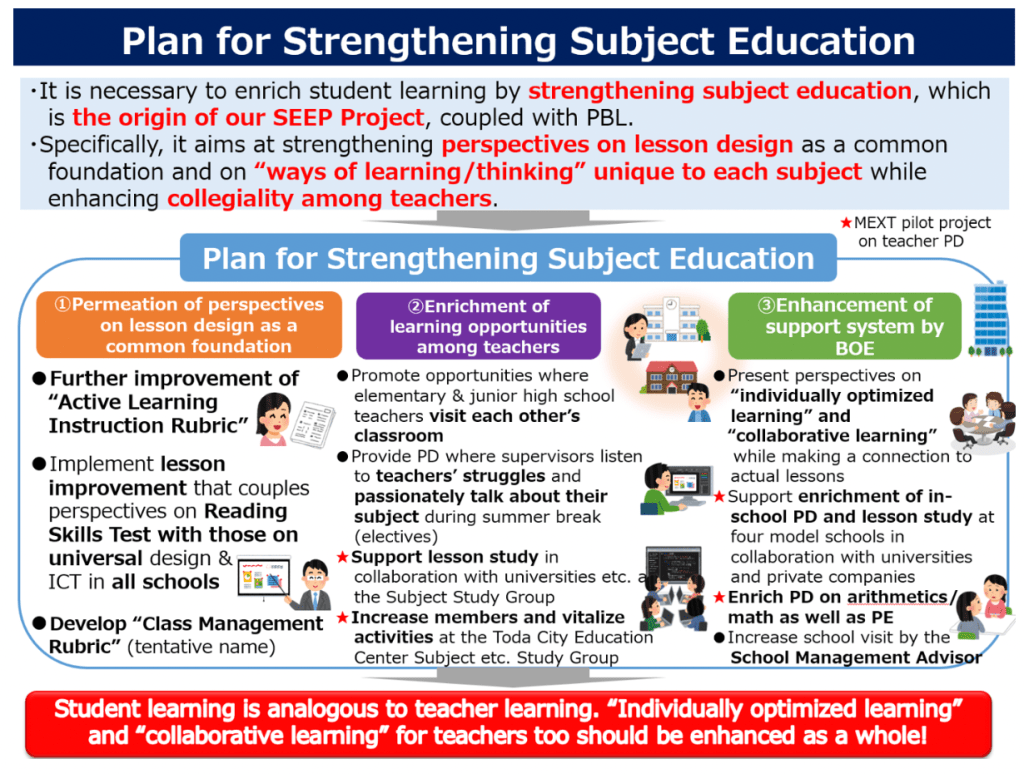 Another important thing was that because there are more and more young teachers who tend to lack a common foundation for teaching and learning, we were faced with the need to re-emphasize the Subject Education (“S” of our SEEP Project). That’s why we created the Plan for Strengthening Subject Education in May 2023. The key concept here is that student learning is analogous to teacher learning. So, in order to realize individually optimized and collaborative learning for students, we, through professional development and other means, need to provide these learning opportunities for teachers.