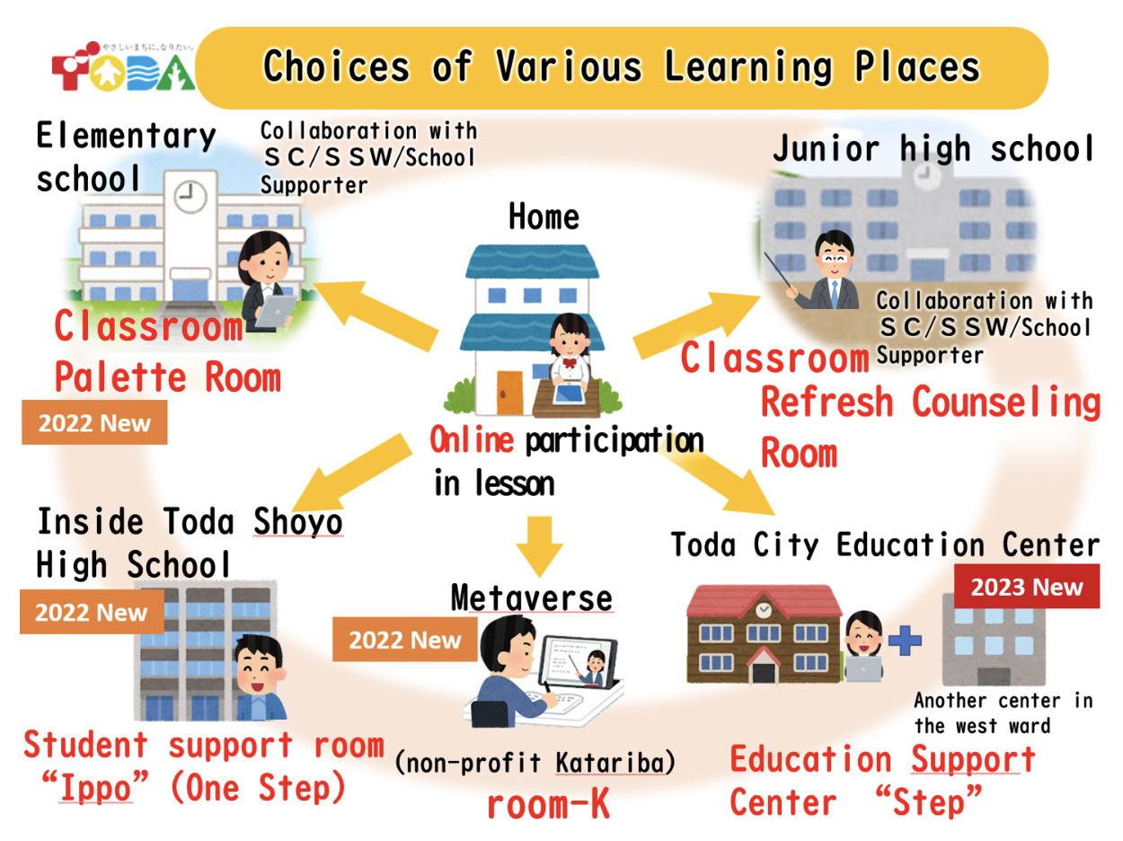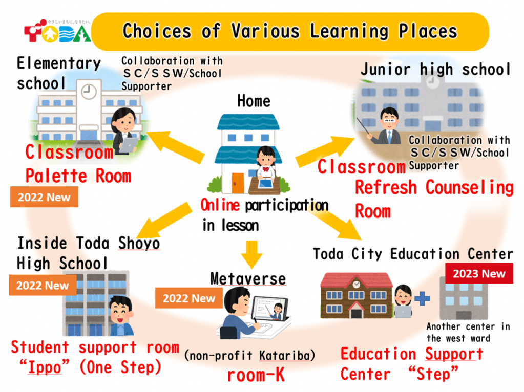 The last big issue is absenteeism. The figures released last October show we hit a record high of 299,048 – with a remarkable increase of 22.1% from the previous year. In order to tackle this problem, in March 2022, we published the Toda-Version Alternative Plan, which aims at an education where nobody will be left behind. What we’re essentially doing is to prepare choices of various learning places. In the last fiscal year, because the number of absentees at the elementary level has been rapidly increasing, we set up in-school support rooms (“Palette Room”) in all the 12 elementary schools for students who are experiencing challenges in the classroom. Depending on their situation, they can choose to participate in classroom lessons virtually from the Palette Room or physically during the day. Also, when some students cannot stay in their classroom due to their developmental issues, they can visit the Palette Room to cool themselves down before returning to their classroom. I also saw an immigrant student, who cannot understand Japanese well, spend some time at the Palette Room to receive one-on-one instruction for a few months, and after then they can keep up with classroom lessons and stop using the Palette Room. In short, students, in consultation with teachers, have the freedom to use this room whenever it fits for them.