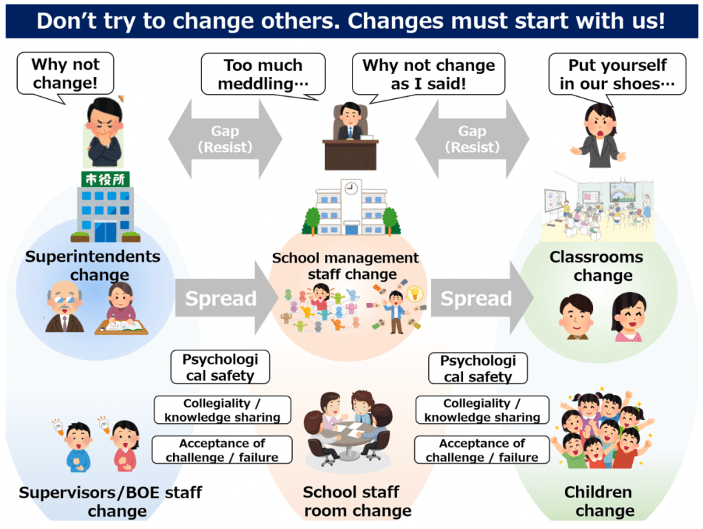 Hirokazu Yokota: I understand that it is very, very difficult to change others. In order to make transformational change in education for students, we should be mindful that change must start with us adults. The typical relationship between the BOE and schools is resistant to these changes, with the board urging schools to make visible changes while educators in schools are fed up with new things imposed from above. We as a BOE wanted to change this image. Thus, the BOE changed first by going outside of the education circle and bringing new movements of the society into our office. This is because in order to implement our SEEP project (as is mentioned in the last post), there is no way but to collaborate with private companies, public sectors and research institutions. At the beginning, BOE officers stopped trying to provide all the contents by themselves, collected raw materials in collaboration with outsiders, “cooked” with these, and then, in a sense, provided schools with the “cuisine” (e.g. BOE reached out to private companies that have contents of programming education, created a curriculum in collaboration with them, and implement it in schools). Gradually, as principals understood that they can do these new things without being threatened, schools became cooks themselves with raw materials provided by the BOE (e.g. schools adjusted their annual curriculum plan so that they can provide programming education in a more coherent way). In this way, principals gradually began to see the benefits and started to change themselves, then this change also spread out to teachers and finally classrooms. Although one teacher can change his or her practice, when it comes to systemic change, I don’t think the transformation comes from the right to the left. It should happen the other way around – BOEs should change first. Additionally, I’m sometimes surprised by the fact that schools, in addition to being cooks, even prepare raw materials by themselves (e.g. some schools reach out to outside experts on programming education without BOE’s involvement, and invite them to their in-school professional development session) . Because there are so many “cooks” in the education governance, which means each stakeholder tries to intervene in school reform in an incoherent way, our approach of giving autonomy to schools while providing support is indispensable.