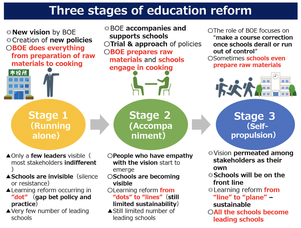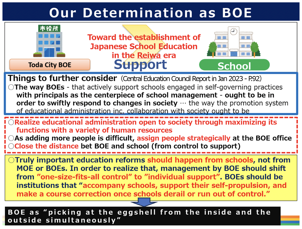 School can be reformed only from within, and truly important education reforms should happen from schools, not from MOE or BOEs. In order to realize that, management by BOE should shift from “one-size-fits-all control” to “individual support,” and BOEs should be institutions that accompany schools and support their self-propulsion.