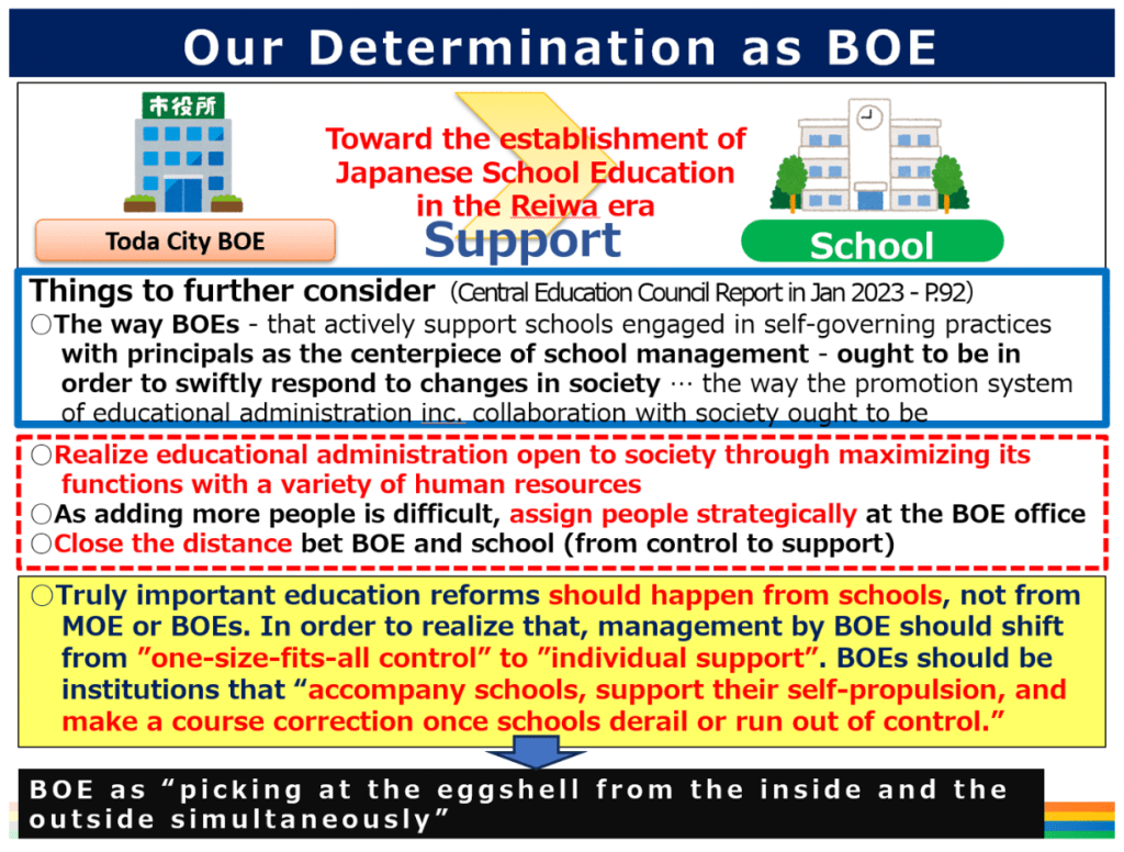 In addition, what makes education policy complicated is its governance system. Also in Japan, there are many reformists who say “Our schools are broken. Let’s fix it.” However, as there are more and more cooks in the kitchen, making coherent and sustainable policies becomes more challenging. That’s why we as a BOE have so much respect for school principals and give them considerable autonomy so that they, with the deepest understanding of individual students, can be engaged in school reform themselves. I believe that school can be reformed only from within and truly important education reforms should happen from schools, not from MOE or BOEs. In order to realize that, management by BOE should shift from “one-size-fits-all control” to “individual support” and BOEs should be institutions that accompany schools and support their self-propulsion.
