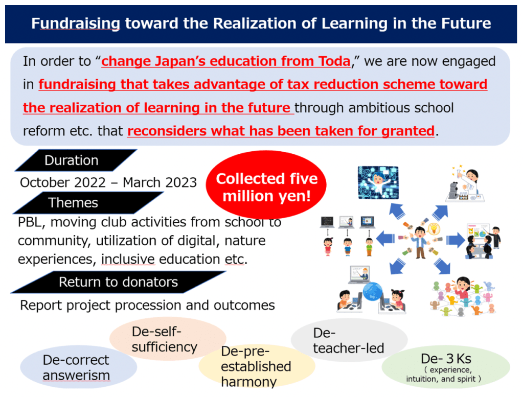 Through a dialogue with schools, I noticed that there are many things that schools want to do if and only if they have more money. Actually, my division’s budget accounts for only 4% of the total education budget of Toda City. With this budget constraint, what I came up with is essentially fundraising by the BOE. We ask our schools to submit ambitious reform proposals, and rather than expecting individual schools to do all the fundraising for their initiatives, we as a BOE collect money for them. We collected 5 million yen in the last fiscal year, and we distributed it to each school to implement. Although an exception for now, I believe this approach will also spread gradually, as the financial condition of governments has become even more challenging recently, and it will continue to be challenging in the future.