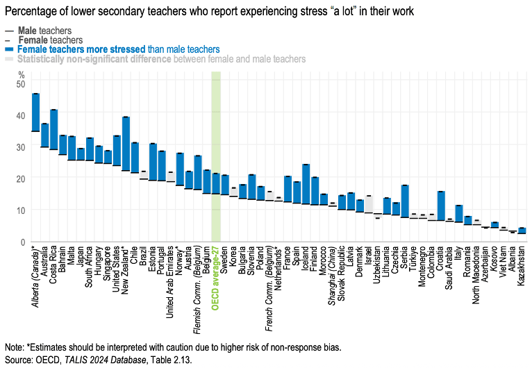 “[N]early 30% of U.S. teachers report frequent on-the-job stress, compared to less than 20% for OECD countries on average. U.S. teachers were also more likely to report that teaching had taken a toll on their mental and physical health. U.S. lower secondary teachers worked on average more than 45 hours a week in 2024, nearly five hours more than the OECD average.”