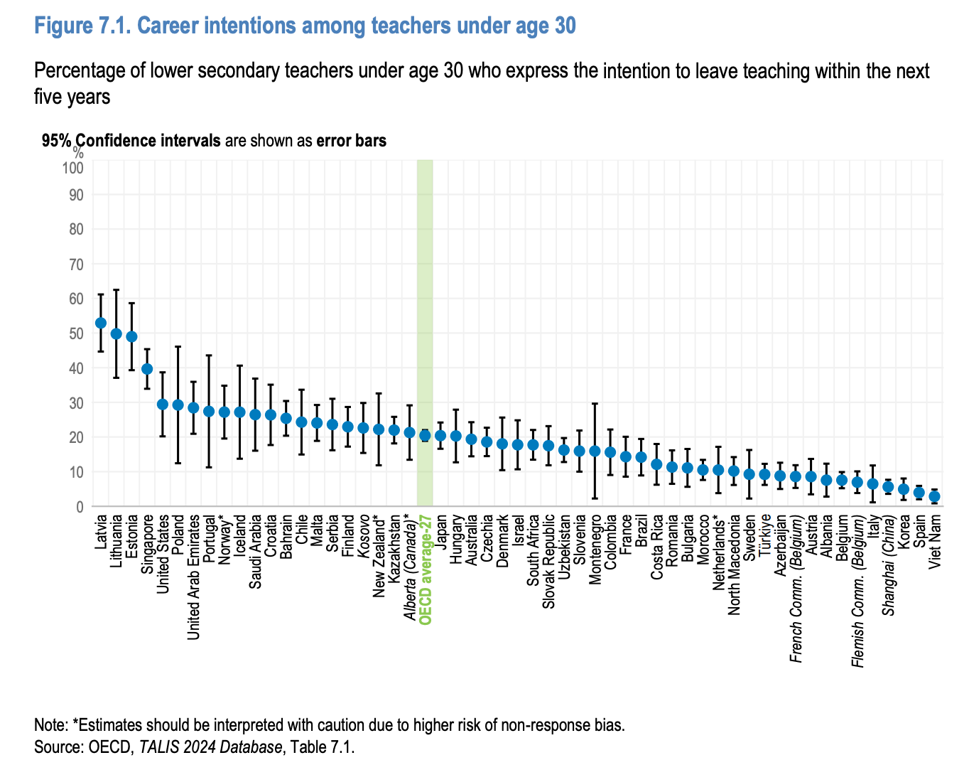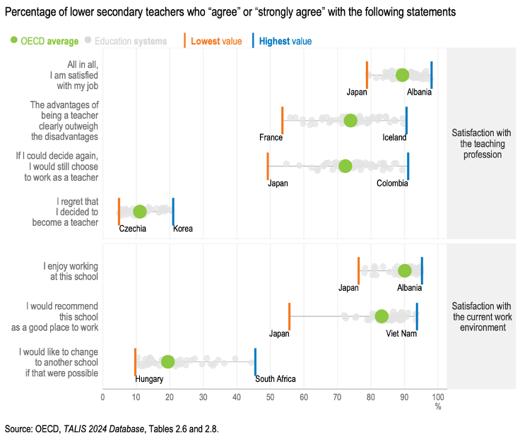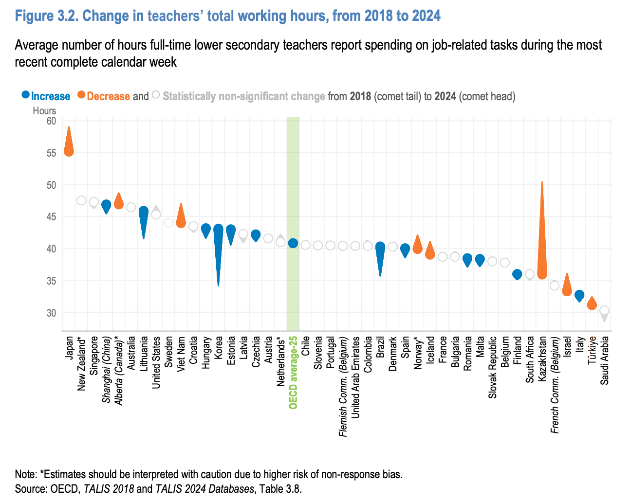 Teachers’ workloads, AI use, and the status of the teaching profession overall are among the key issues highlighted by the media sources that covered the recent release of OECD’s Teaching and Learning International Survey (TALIS) 2024. In this second part of a two-part post, IEN rounds up some of the headlines that discuss the results for different countries. Part 1 provided a summary of OECD’s results, and Part 2 will For comparison, see previous coverage of the release of the results of TALIS 20218 (Volume 1; Volume 2).