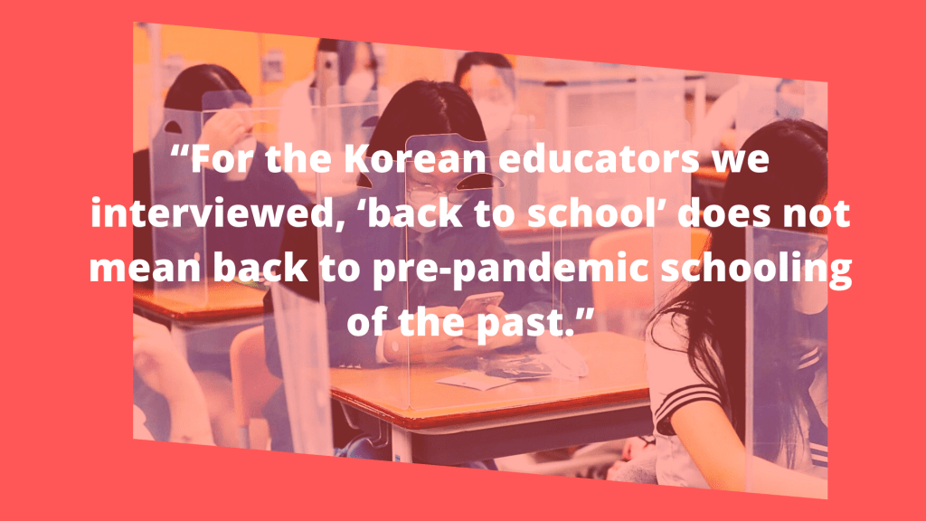 “Schooling during the pandemic has thus necessarily revealed challenges that must be addressed (e.g., widening achievement gaps), but it also surfaced opportunities for challenging the “old grammar of schooling” in how Korean educators took ownership of educational changes to collectively envision better ways of schooling during and after COVID-19.”